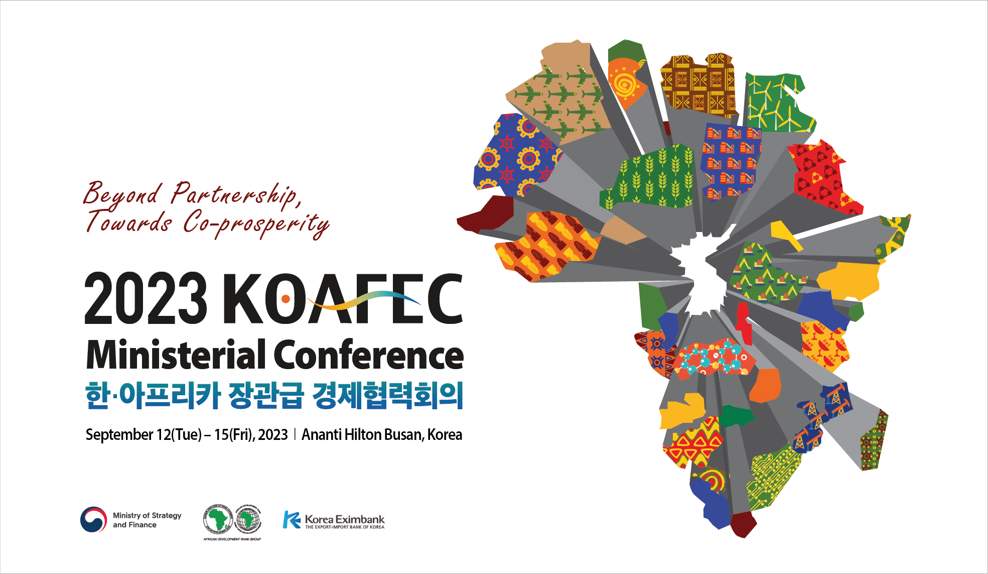 AfDB(아프리카개발은행)과 기획재정부, 한국수출입은행이 주최하는 제7차 한·아프리카 장관급 경제협력회의(2023 KOAFEC Ministerial Conference)는 한국과 아프리카 간 가장 영향력 있는 경제 협력회의로 금번 회의는 2023년 9월 12일(화)부터 15일(금)까지 아난티 힐튼 부산에서 진행됩니다.