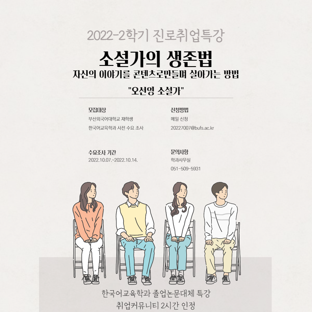 안녕하십니까. 한국어교육학과 조교입니다. 2022-2학기 진로취업특강을 진행합니다. 따라서, 한국어교육학과에서는 사전 수요조사를 진행하여 특강 신청을 받고자 합니다. 확인하셔서 신청해주시길 바랍니다. 1. 주 제 : 소설가의 생존법 : 자신의 이야기를 콘텐츠로 만들며 살아가는 방법 2. 모집 대상 : 부산외국어대학교 재학생 (한국어교육학과 사전 수요조사 진행) 3. 일 시 : 2022.11.02.(수) 14:00~16:00 4. 신청 기간 : 2022.10.07.~2022.10.14. 5. 신청 방법 : 학번/이름/현재 이수학기(EX.4학년 2학기) 작성 하여 메일 전송 (20227007@bufs.ac.kr) * 신청은 선착순으로 받습니다. ** 부산외국어대학교 전 학생을 대상으로 하는 진로취업특강입니다.