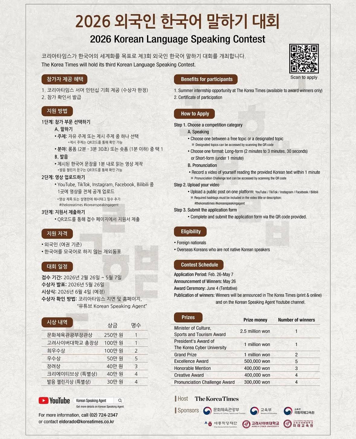 - 수상자 발표: 2026.05.26. (코리아타임스 지면 및 홈페이지, 유튜브 채널 Korean Speaking Agent에서 확인가능)