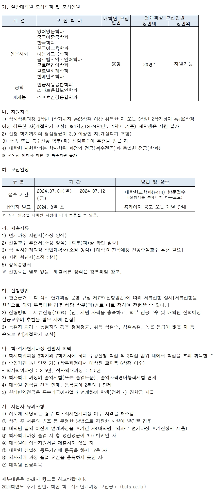 2024학년도 후기 일반대학원 학·석사연계과정 모집공고