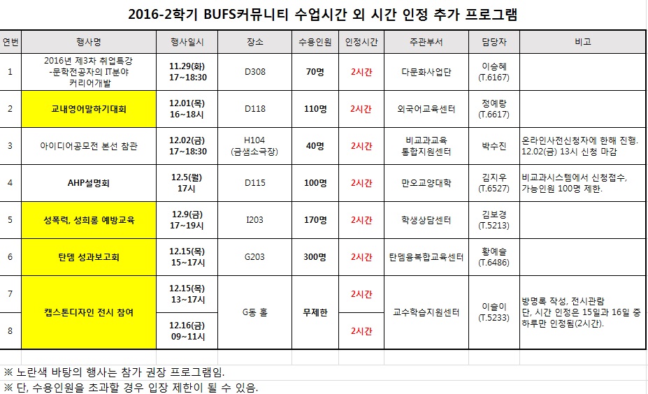 전공게시판 BUFS커뮤니티 수업시간 외 시간 인정 추가 프로그램 . c1f36891.jpgf7e6fcbd.xlsx 최고관리자2016. 11. 30조회수3,614 0 등록된 댓글이 없습니다. 2017학년도 인문융합전공[ARE…목록BUFS커뮤니티 수업 외 시간이수…