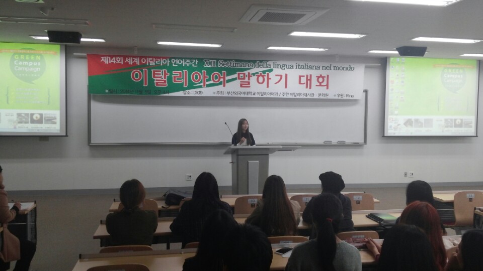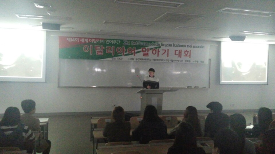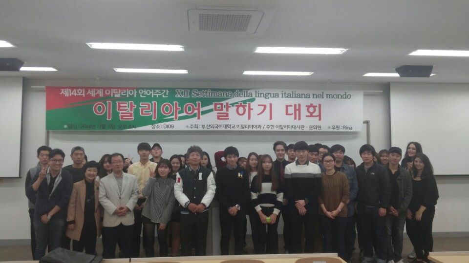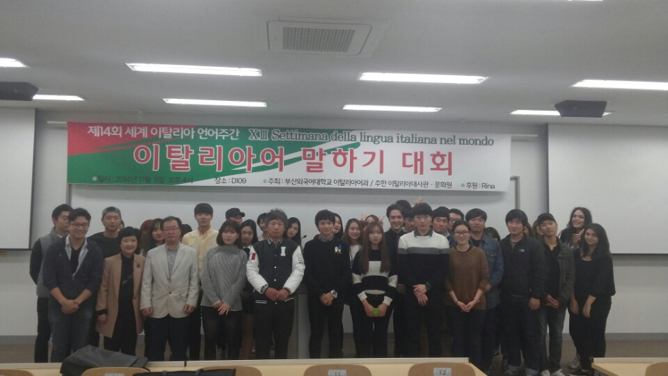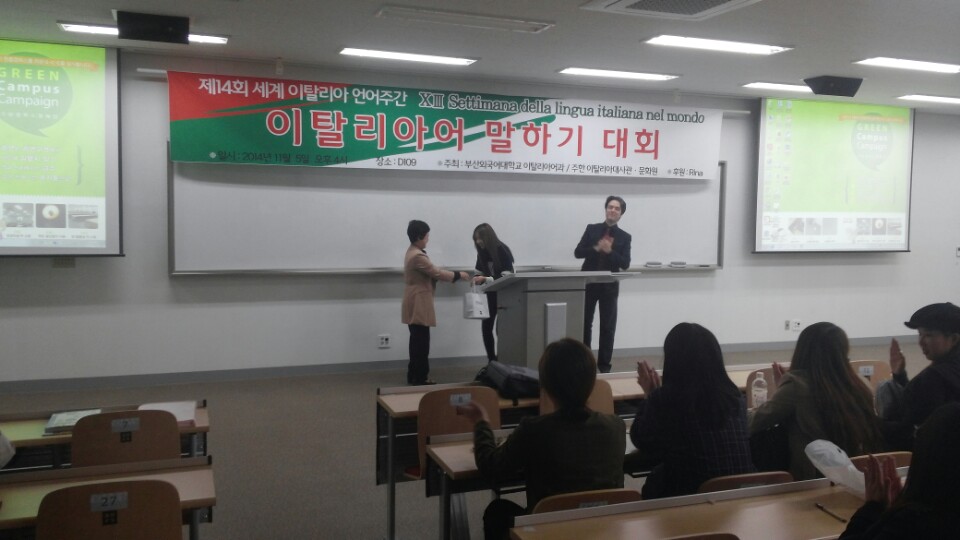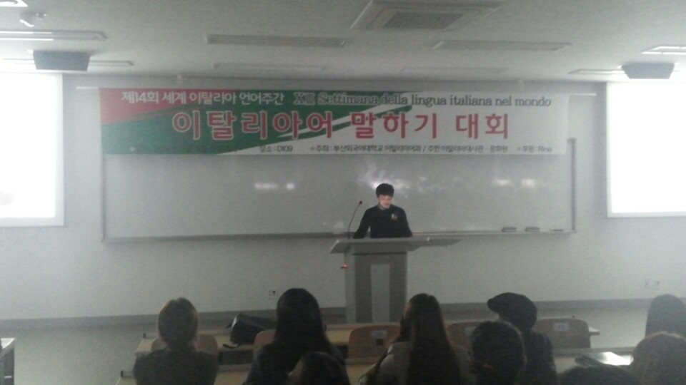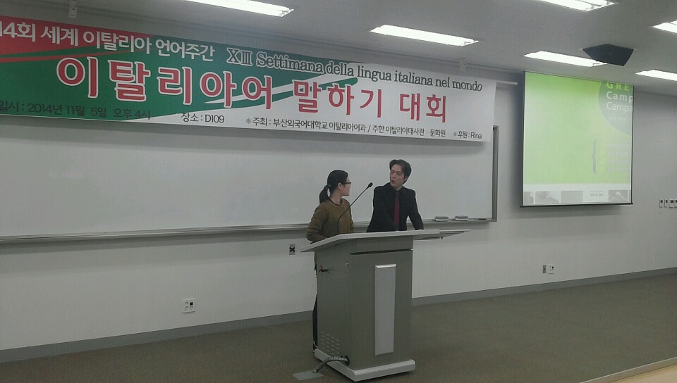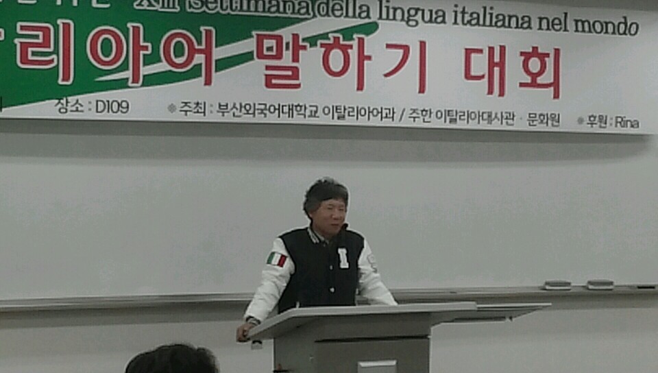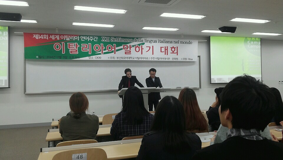 2014년 11월 5일 수요일 오후 4시 제 14회 세계 이탈리아 언어주간을 맞이하여 부산외국어대학교 이탈리아어과에서 주최하는 말하기 대회가 개최되었습니다.^^ 대회를 시작하기전 박상진 학과장 교수님 및 빈첸쵸 교수님의 축하인사 말씀이 있으셨습니다.