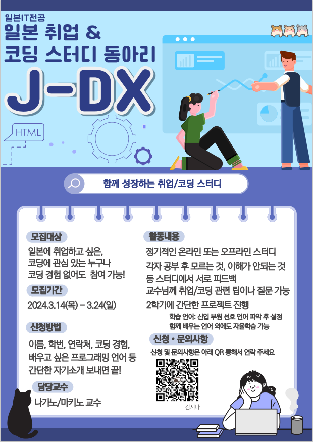 전공생활 코딩 스터디 동아리 J-DX J-DX 동아리는 IT 학습 뿐만 아니라 일본어 스터디, 일본 취업 활동 등, 폭넓은 범위를 다루는 동아리입니다. 일본IT전공2024. 3. 13 0 등록된 댓글이 없습니다. JBIT-united 동아리목록