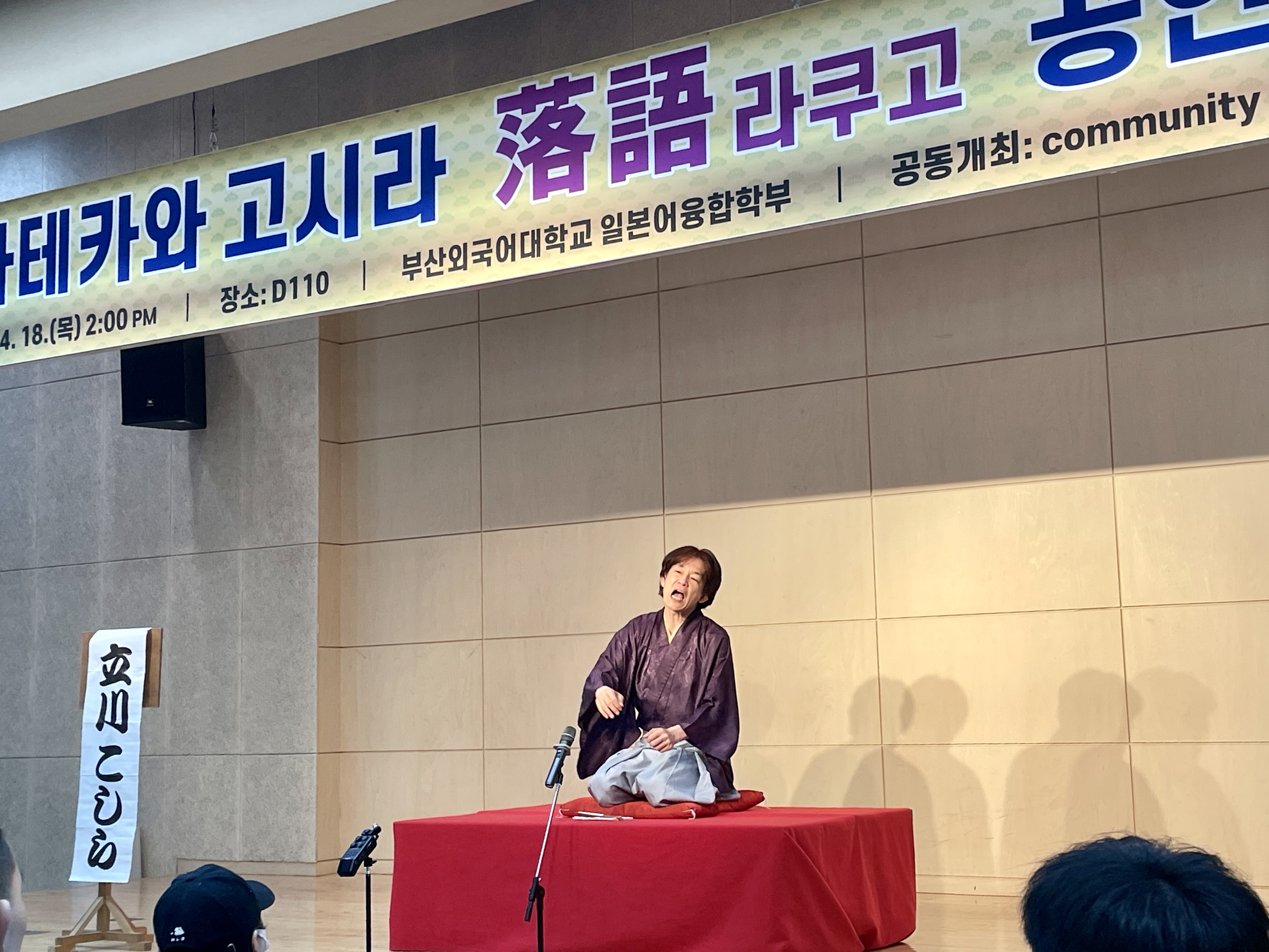 2024년 4월 19일 D110에서 라쿠고(落語) 공연이 열렸습니다! 라쿠고란 무대에서 한 사람이 음악이나 무대효과를 사용하지 않고 오로지 라쿠고가의 몸짓과 입담만으로 이야기를 풀어나가는 일본의 전통 공연입니다. 본교의 학생들은 라쿠고 공연을 통해 시험기간 쌓였던 스트레스를 푸는 동시에, 일본의 문화인 라쿠고를 직접 보고 들을 수 있는 귀중한 경험을 가졌습니다. 참석해주셔서 감사합니다.