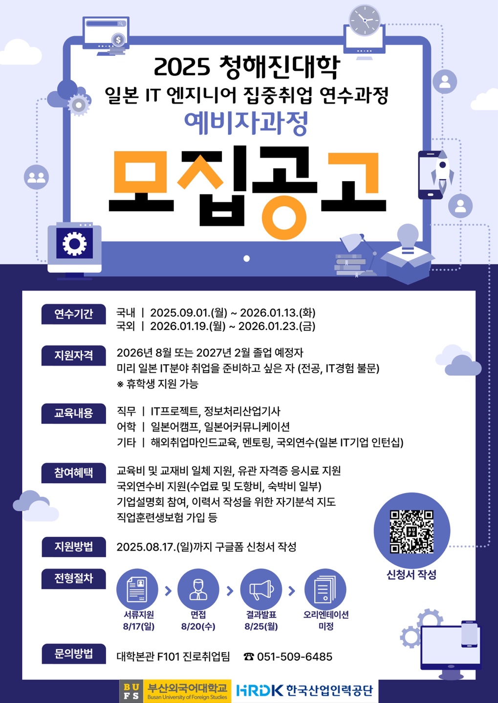 2025년 청해진 일본 IT 엔지니어 집중취업 연수 과정에서 예비자과정 연수생을 모집하고 있습니다.