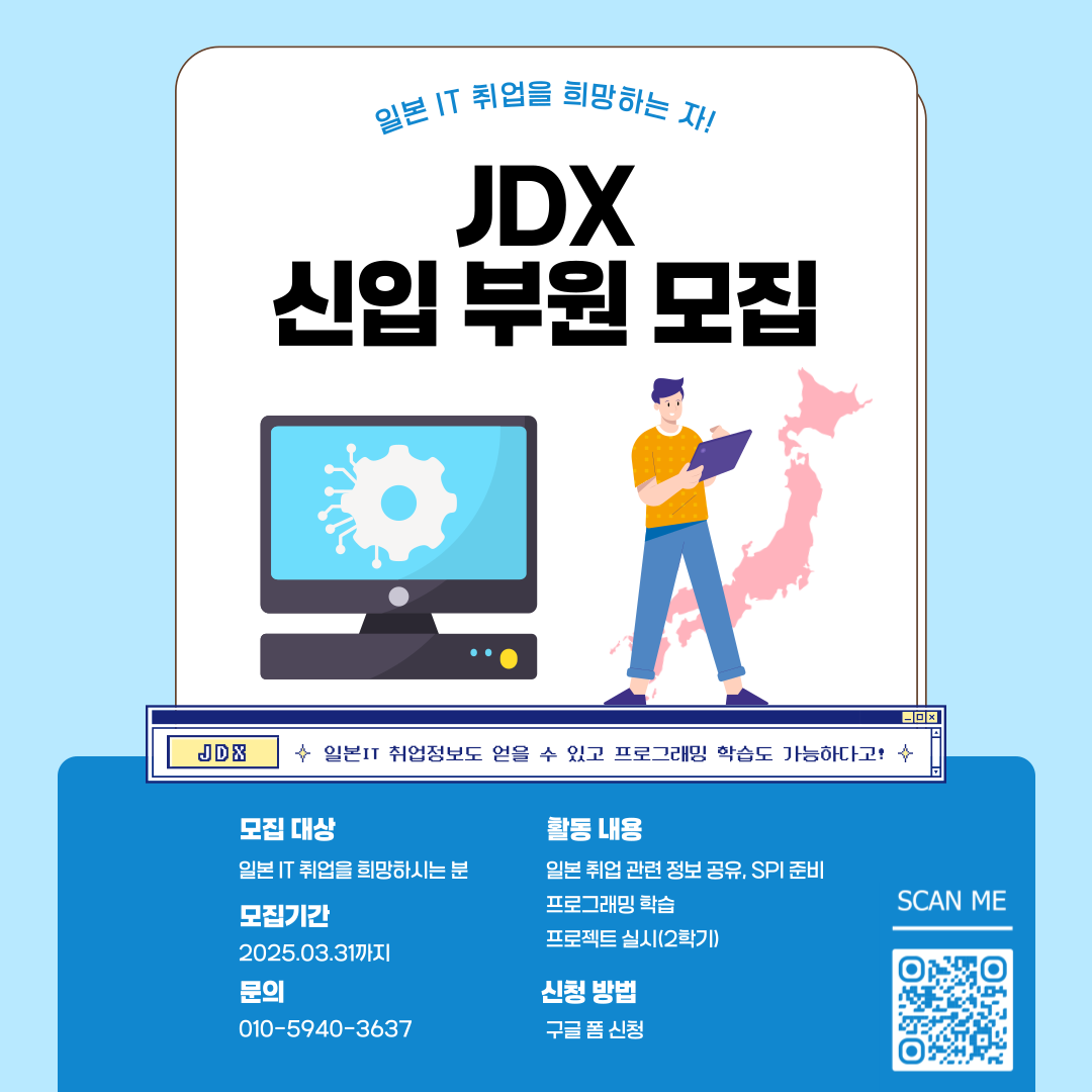 일본 IT 전공 공지 JDX에서 신입부원을 모집합니다! 일본IT취업에 관심이 있으시면 참여해주세요!※프로그래밍 미경험자분들도 환영합니다! 일본IT전공2025. 4. 16조회수163 IT 학술 동아리 <JBIT…목록해커톤 대회 설문조사 안내