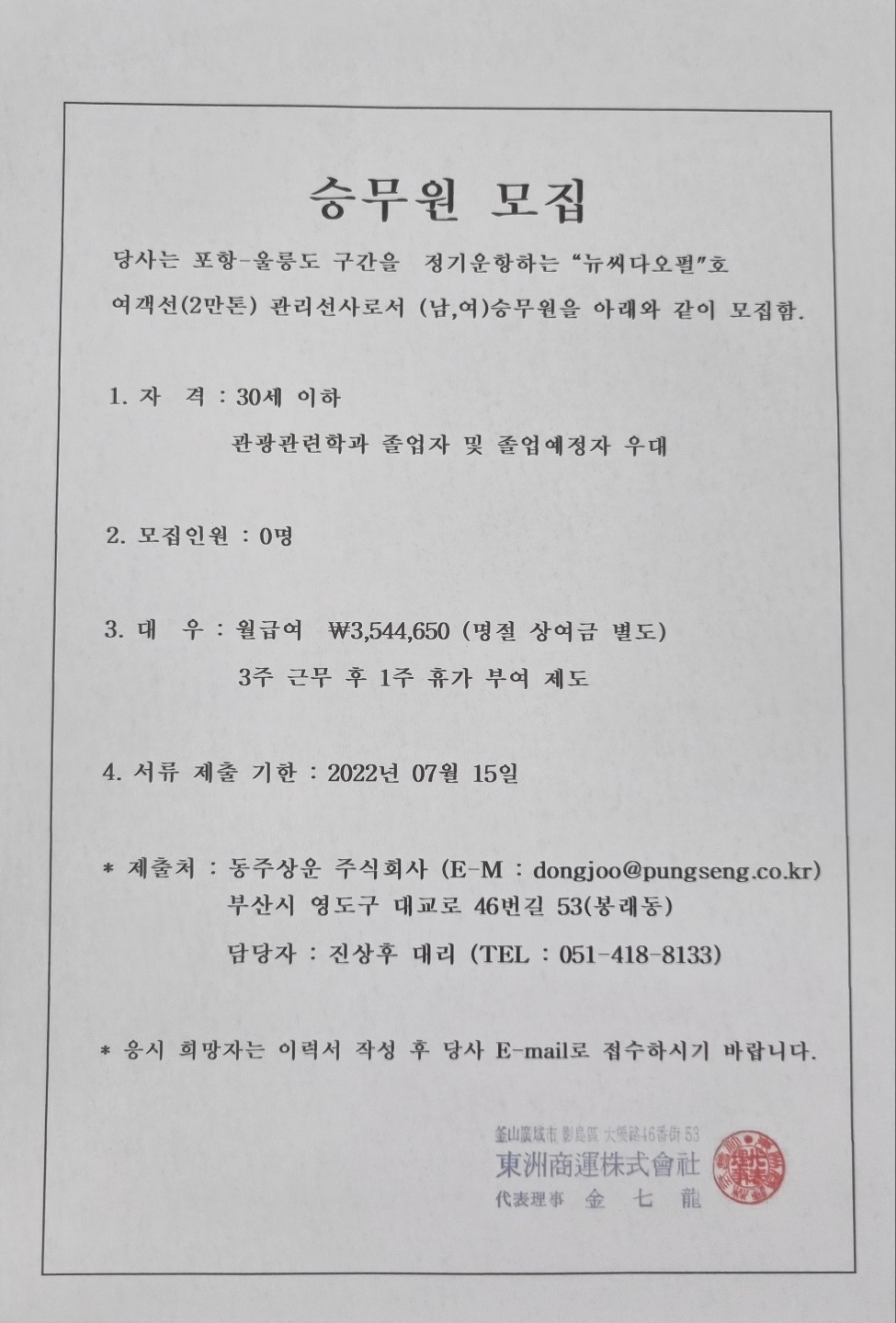 학과게시판 취업알림 동주상운 취업공고 동주상운 주식회사 승무원 모집제출희망자는 김미준 교수 : 010-2264-2105 로 연락바랍니다. 일본어융합학부관리자2022. 7. 4조회수1,505 0 등록된 댓글이 없습니다. [일본어융합학부]2022학년도 2…목록학부소개 영상 제작 학생 모집
