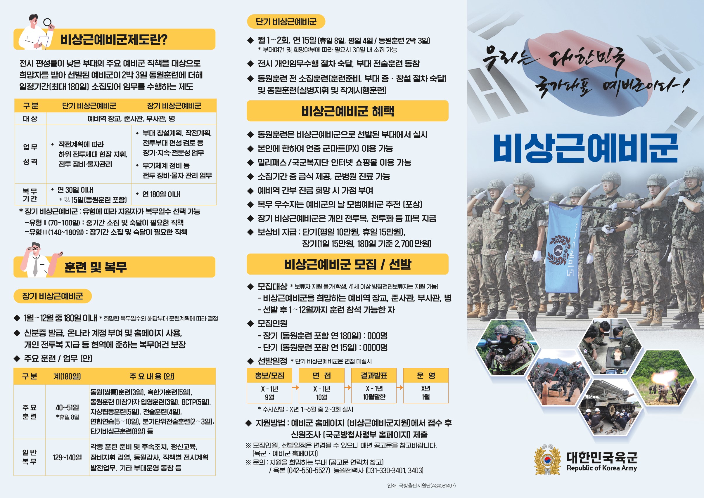 예비군대대 공지사항 (홍보) 비상근예비군 모집 (열람대상: 학생예비군 / 열람기간: ~ 24. 9. 29.) 첨부파일카드뉴스,포스터 1.pdf(562.4K) 비상근예비군 모집 홍보물입니다.관심있는 분들 첨부파일 포함하여 참고하시기 바랍니다. 예비군대대관리자2024. 9. 5조회수299 예비군훈련 (9.12.) 참석 안…목록예비군대대 카페 및 카카오채널 활…