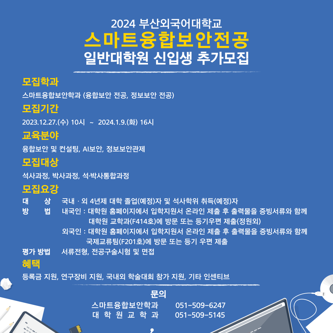 학과게시판 2024 부산외국어대학교 스마트융합보안전공 일반대학원 신입생 추가모집 안내 스마트융합보안학과관리자2023. 12. 26조회수479 0 등록된 댓글이 없습니다. 2024학년도 스마트융합보안학과 …목록[SK쉴더스 홍보] 2023 부산…