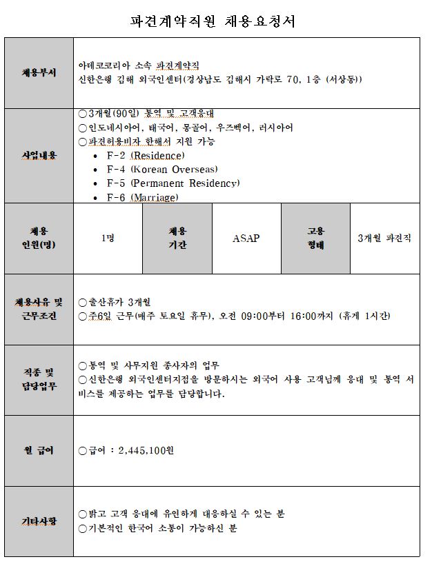 [단기] 김해외국인센터 신한은행 파견계약직 직원 모집