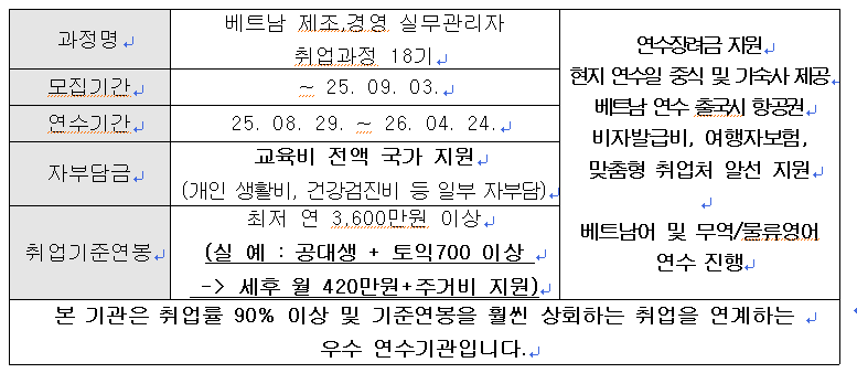 ✔지원사항: 연수비 전액 지원/연수장려금 월20만원 지원/베트남 연수 출국 시 항공권 지원/베트남 연수 시 기숙사 및 중식비 지원/복수 비자 발급비 및 연수기간 국외 보험 지원/해외취업정착지원금 지원 연계