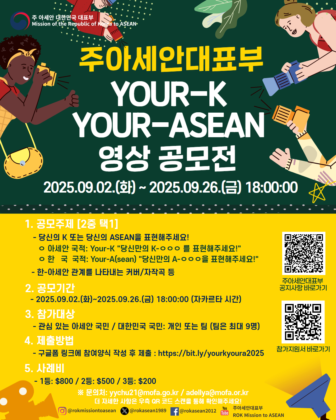 주아세안 대한민국 대표부에서 한-아세안 관계에 대한 관심을 제고하고자 '2025 YOUR-K, YOUR-ASEAN 영상 공모전' 을 개최합니다.