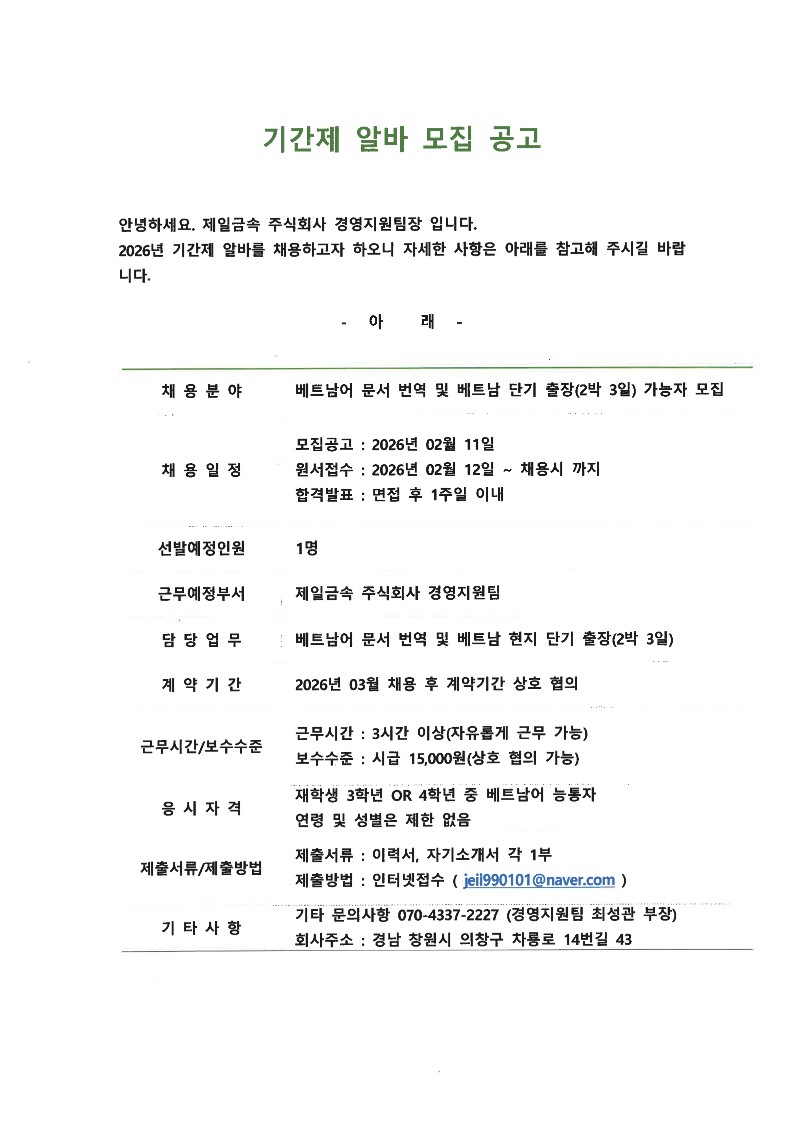 학과게시판 구인공고 [제일금속] 기간제 알바 모집 공고 베트남어과관리자2026. 2. 12조회수93 0 등록된 댓글이 없습니다. [공지] 2026학년도 1학기 베…목록[공지] 2026학년도 호찌민인사…