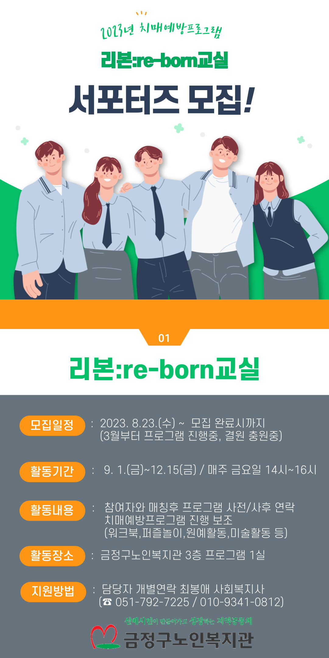 학과게시판 자원봉사 모집 금정구노인복지관 치매예방프로그램 서포터즈 모집 가. 내용 : 치매예방 서포터즈 모집 홍보 나. 모집홍보 기간 : 2023. 8.23(수) ~ 정원 10명 모집시까지 사회복지학과관리자2023. 8. 23조회수441 0 등록된 댓글이 없습니다. [정보통신원] 어도비(Adobe)…목록2023 화명종합사회복지관 <…