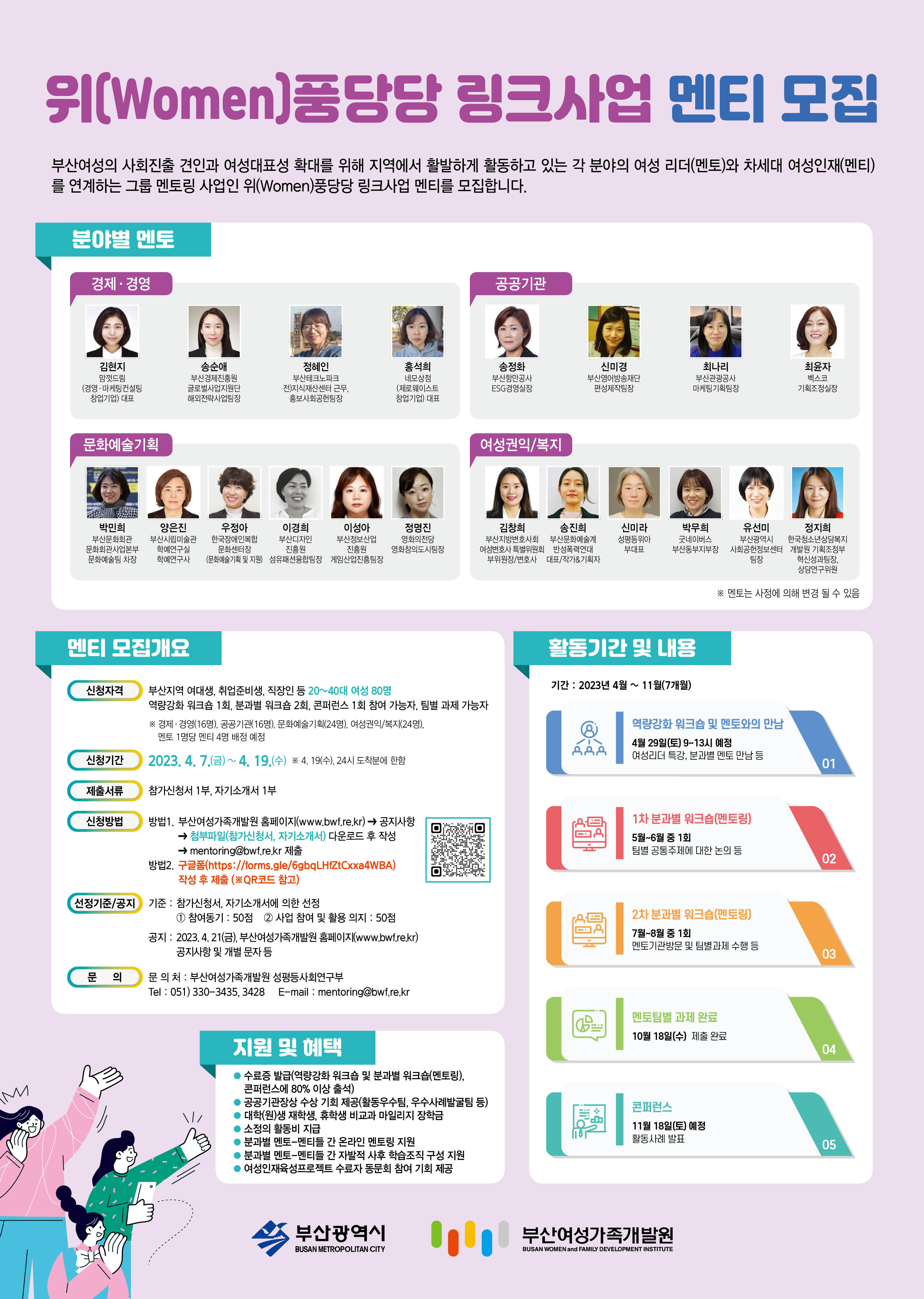 부산광역시와 부산여성가족개발원은 각 분야별 여성 리더(멘토)와 차세대 여성인재 (멘티)를 연계하는 위(Women)풍당당 링크사업을 진행합니다.