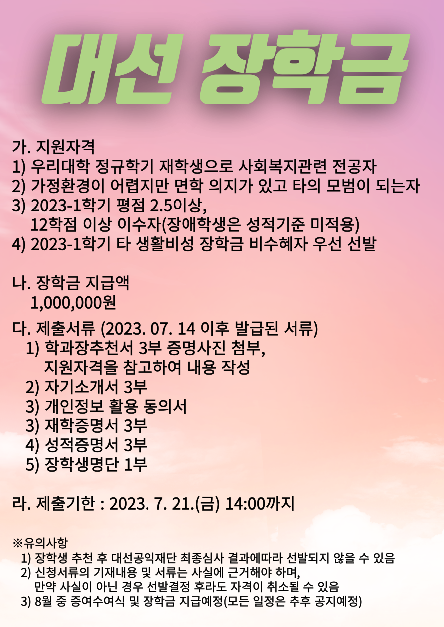 사회복지 전문 인재양성을 위해 2023년 제17회 대선장학생을 아래와 같이 선발합니다.