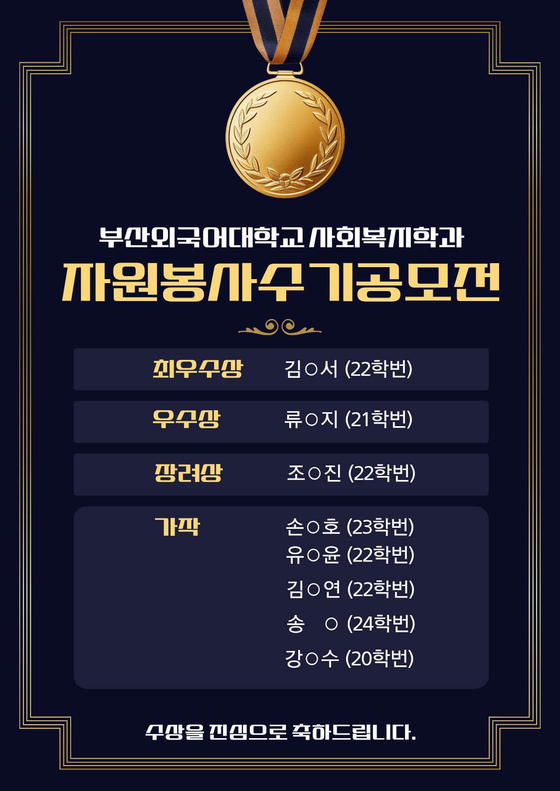 2025학년도 부산외국어대학교 자원봉사수기공모전 수상자 명단